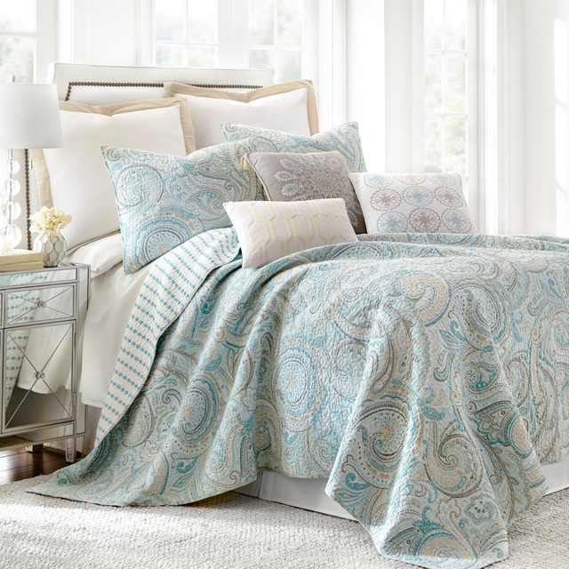 Wrap your space in warmth and elegance with the Spruce Spa Reversible Quilt and Sham Set by Levtex Home. Crafted from soft, lightweight cotton, it features a rich, intricate paisley design in soft spand tans. Flip it to reveal a simple blue dotted design for a fresh look. This machine-washable set blends traditional charm with modern comfort, adding a sophisticated, colorful touch that transforms any bedroom or bathroom.