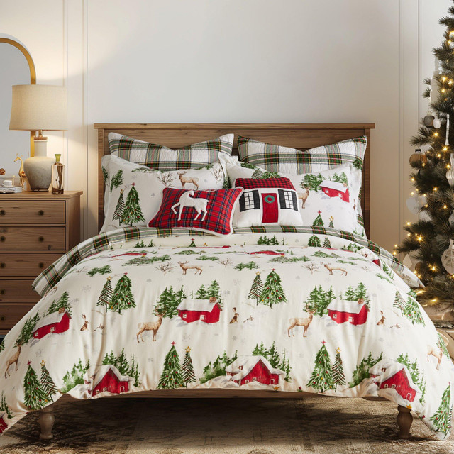 The Tatum Pines Comforter Set by Levtex Home is inspired by a holiday trip to a mountain cabin. Offered in red, green, brown and white, this design will immediately transform your bedroom. Made with a soft, luxurious cotton, this comforter set features an array of forest animals in the snow with grand pines and red cabins in the distance on the front and a green and red plaid on white on the reverse. It is filled with a hypoallergenic 100% polyester filler. Machine washable.