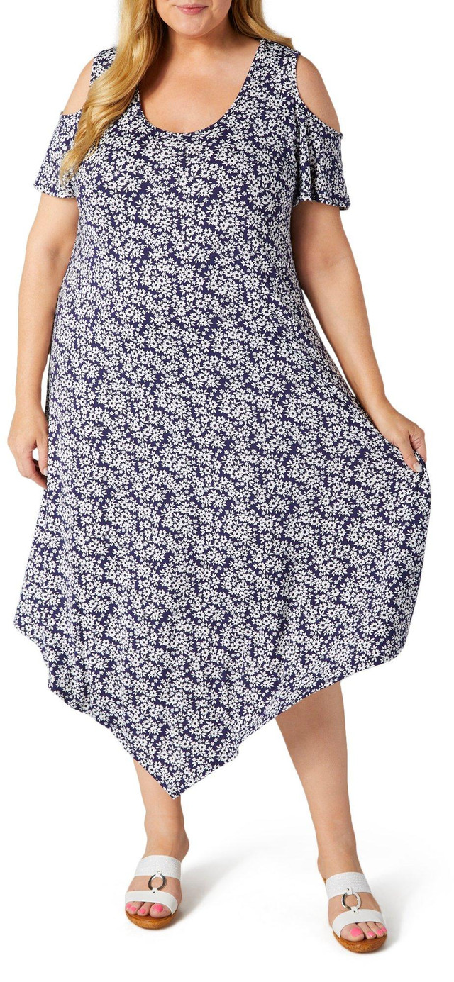 Step into whimsical charm with this Short Sleeve Midi Dress. Featuring cold shoulder details, it adds a trendy and playful touch to your look. The ditsy floral print brings a burst of color and personality, while the hanky hem offers a unique and stylish finish. Perfect for any occasion, this dress combines comfort and elegance effortlessly. Stand out with grace and flair in this delightful piece. Fabrication is 95% polyester, 5% spandex.
