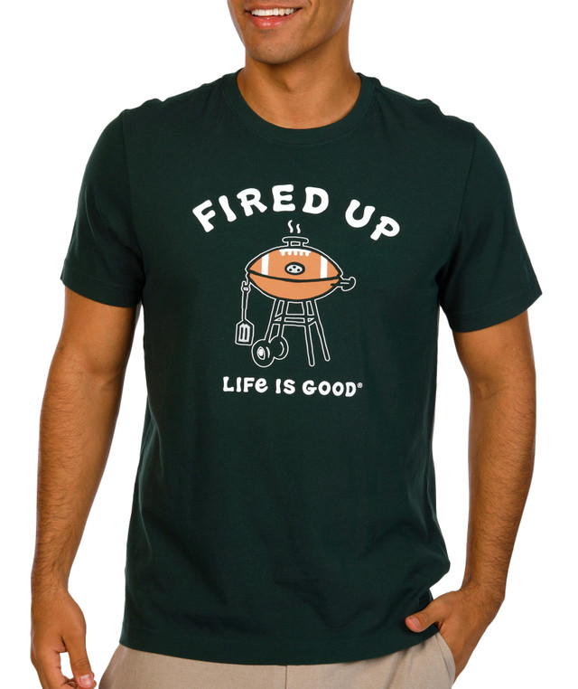 This men's Fired Up Grill graphic T-shirt features short sleeves, a crew neckline, and a bold football grill graphic with Fired Up script. Perfect for game day or casual wear, it brings sporty energy and standout style to any look.