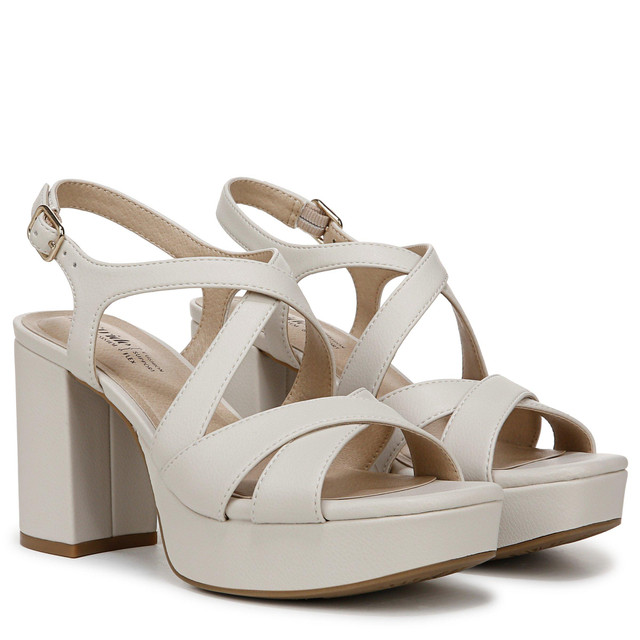 Take your look to the next level in these comfortable platforms with a stylish strappy design. The platform heels are designed with faux leather or woven fabric, an open toe, heel strap with adjustable buckle, and crisscrossing strap accent. The linings are crafted from partially recycled materials. Features Trusted Soft System® comfort technology for unmatched cushion, support, and flexibility in every pair. Traction sole for extra stability. Just Right Height 3.5-inch platform heel.