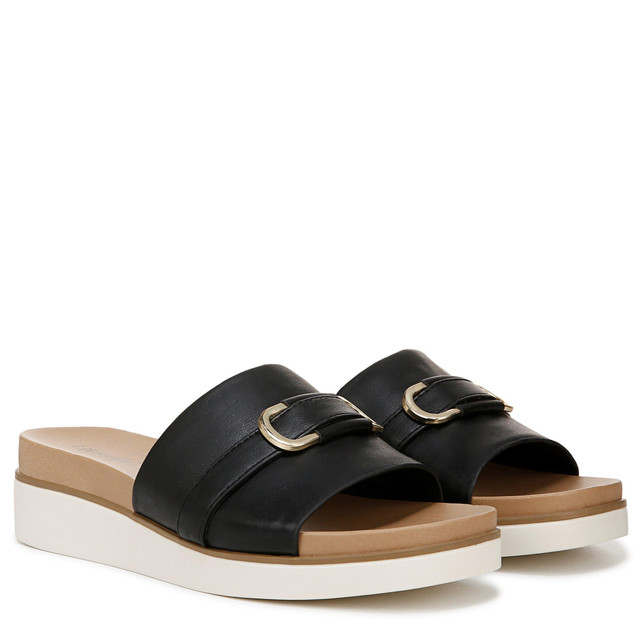 Walk with comfort and confidence in the Genevieve slide sandals. They feature a faux leather or woven fabric design, a soft square open toe, slip-on styling, metallic ornament detail, a lightweight design, linings crafted from partially recycled materials, Trusted Soft System® comfort technology for unmatched cushion, support, and flexibility, and traction soles for extra stability. Just Right Height 1.25 in. platform heel.