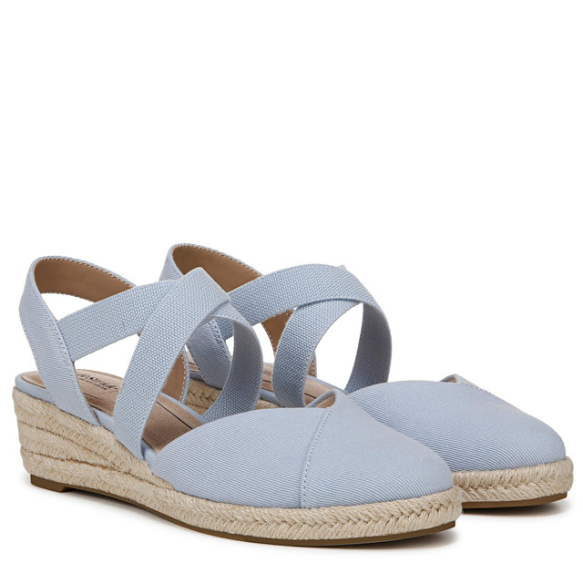Go nautical in the Kimball espadrille wedges. They feature a canvas fabric upper design, almond toe, slip-on fit, crisscrossing stretch gore straps for easy on/off, jute-wrapped wedge heel, linings crafted from partially recycled materials, Trusted Soft System® comfort technology for unmatched cushion, support, and flexibility, shock absorption with pressure distribution and superior cushioning for an effortless feel, and traction soles for extra stability. Just Right Height 1.75 in. wedge heel.