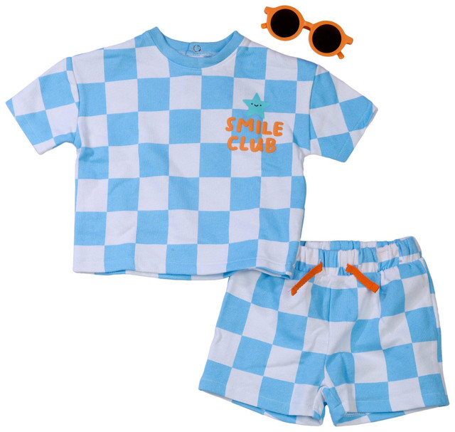 Add playful charm to warm weather outfits with this Baby Boys 3 Pc Checkered Short Set & Sunglasses. Featuring a cheerful Smile Club print on a checkered cotton shirt, paired with coordinating shorts and round sunglasses for a fun, coordinated look. Made from soft, breathable cotton. Ideal for casual outings and sunny days. Machine washable for easy care.