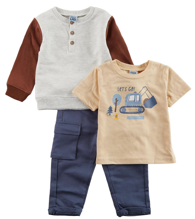 This 3-piece baby boys set includes a long sleeve henley, a short sleeve tee, and solid cargo pants. Soft and comfortable, it offers a versatile and stylish outfit perfect for everyday play and adventures.