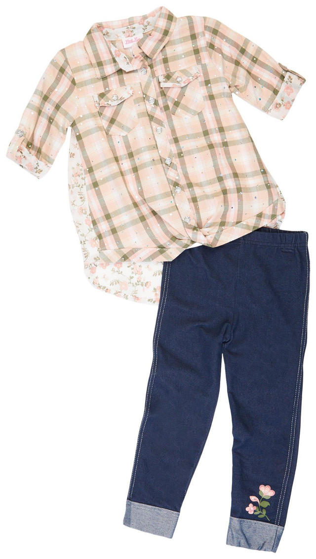 This set includes a stylish plaid top and stretchy denim pants for a complete look. The top is made from a soft blend of 59% cotton and 41% polyester with a 100% polyester lining for added comfort. The bottoms feature a flexible mix of 75% cotton, 20% polyester, and 5% spandex for easy movement. The top should be machine washed and dried flat. The pants are machine washable and tumble dry safe. Perfect for everyday wear or special outings.