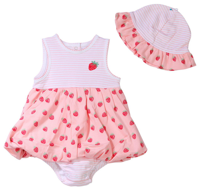 This sweet baby girl dress from Little Me features a strawberry print with a matching diaper cover and hat. Made from soft cotton, it offers comfort and charm for sunny outings or photo moments. The coordinated pieces create a fresh look that is both playful and practical.