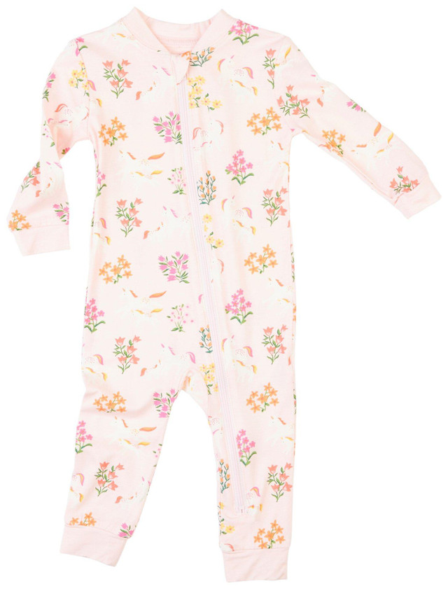 Drift into dreamland with this baby girls unicorn long sleeve zip sleeper. Made from a cozy blend of 95% viscose and 5% spandex, its soft, stretchy, and gentle on delicate skin. Featuring a magical unicorn and floral print, this sleeper zips up for easy changes and full coverage. Machine wash and tumble dry for simple care. Perfect for bedtime snuggles and sweet dreams.