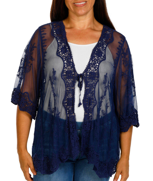 This plus size cardigan features a sheer mesh fabric with delicate embroidery throughout. The three quarter sleeves add a touch of elegance while the front tie closure offers a flattering fit. Perfect for layering over your favorite outfits for a light and graceful finish. Fabrication 50% cotton, 50% polyester