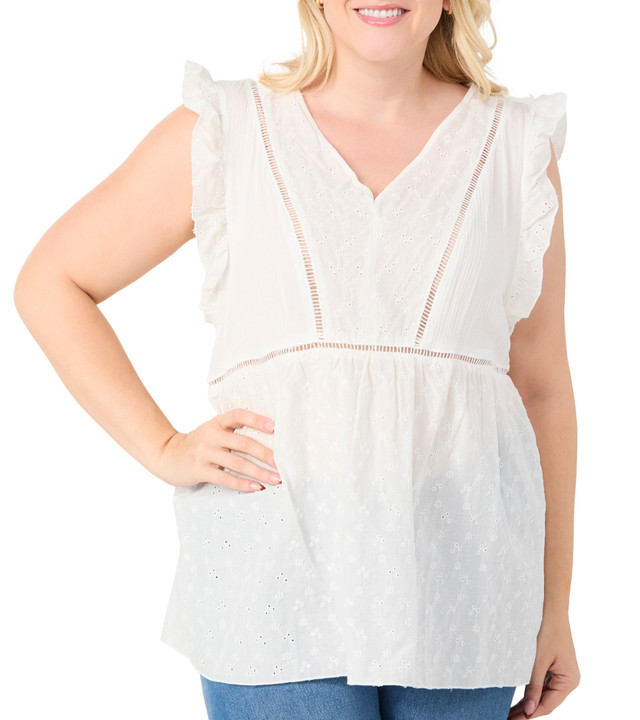 Add timeless charm to your look with the Flutter Sleeve Eyelet Top. Featuring delicate eyelet detailing and graceful flutter sleeves, this lightweight blouse blends feminine style with everyday comfort.