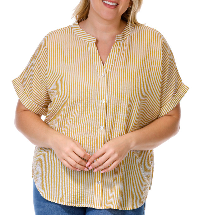 Stay cool and polished in this plus size short sleeve seersucker stripe top. Featuring a classic button down front closure, its designed with lightweight texture and timeless stripes for breathable comfort. Easy to dress up or down, this versatile top is perfect for everyday wear with a fresh, casual feel. Top length measures approximately 27 inches. Fabrication 100% polyester