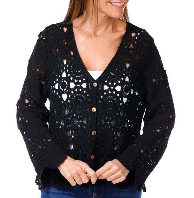 Add effortless style to your look with the Womens Long Sleeve Button Crochet Sweater. This V-neck crochet sweater features a button front with wood look buttons and a delicate circle crochet design for a boho chic touch. Perfect for layering over tanks or dresses for any season. Fabrication is 100% cotton. Length measures approximately 25 in.