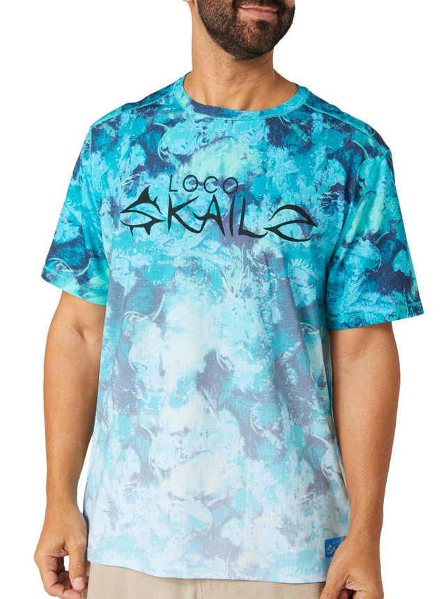 This short sleeve shirt features a fishing print design on lightweight fabric, a crew neckline, moisture-wicking technology, UPF 50 sun protection, and a comfortable fit. Perfect for any land or sea adventure. Fabrication is 92% polyester, 8% spandex. The top length measures approximately 27 in.