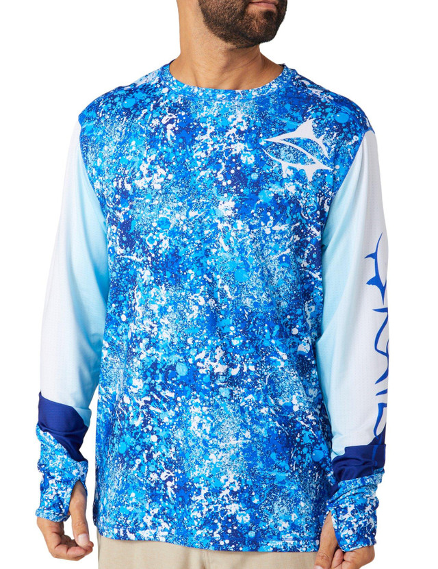This long sleeve tshirt features a fishing print design on lightweight fabric, a crew neckline, moisture-wicking technology, UPF 50 sun protection, and a comfortable fit. Perfect for any land or sea adventure. Fabrication is 92% polyester, 8% spandex. The top length measures approximately 27 in.