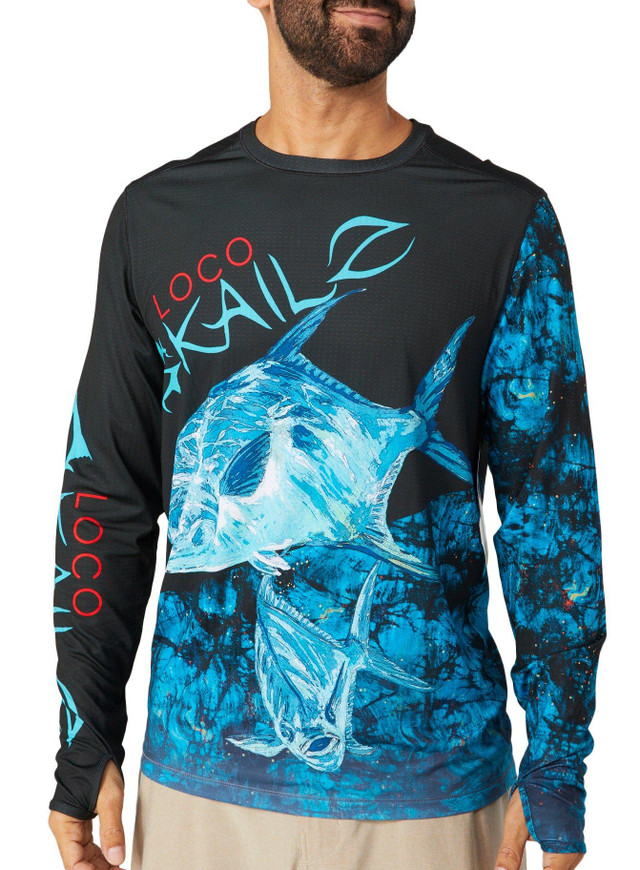 This long sleeve shirt features a fishing print design on lightweight fabric, a crew neckline, moisture-wicking technology, UPF 50 sun protection, and a comfortable fit. Perfect for any land or sea adventure. Fabrication is 92% polyester, 8% spandex. The top length measures approximately 27 in.