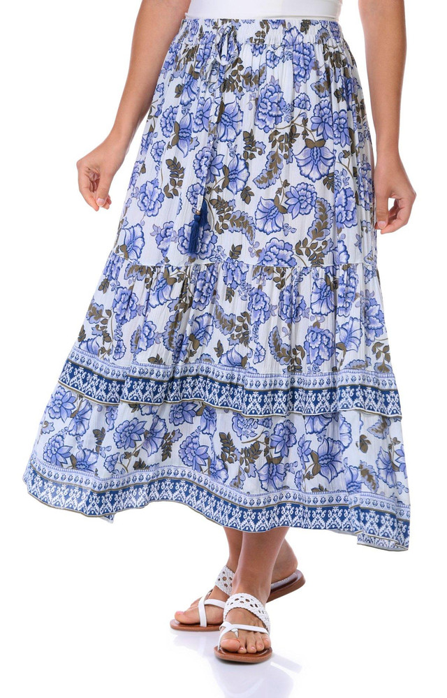 This womens floral tiered midi skirt is made of 100 percent rayon for a soft and airy feel. It features a charming floral print, elastic waistband with tassel drawstring ties and a ruffle hem that adds a touch of playful elegance to any outfit.