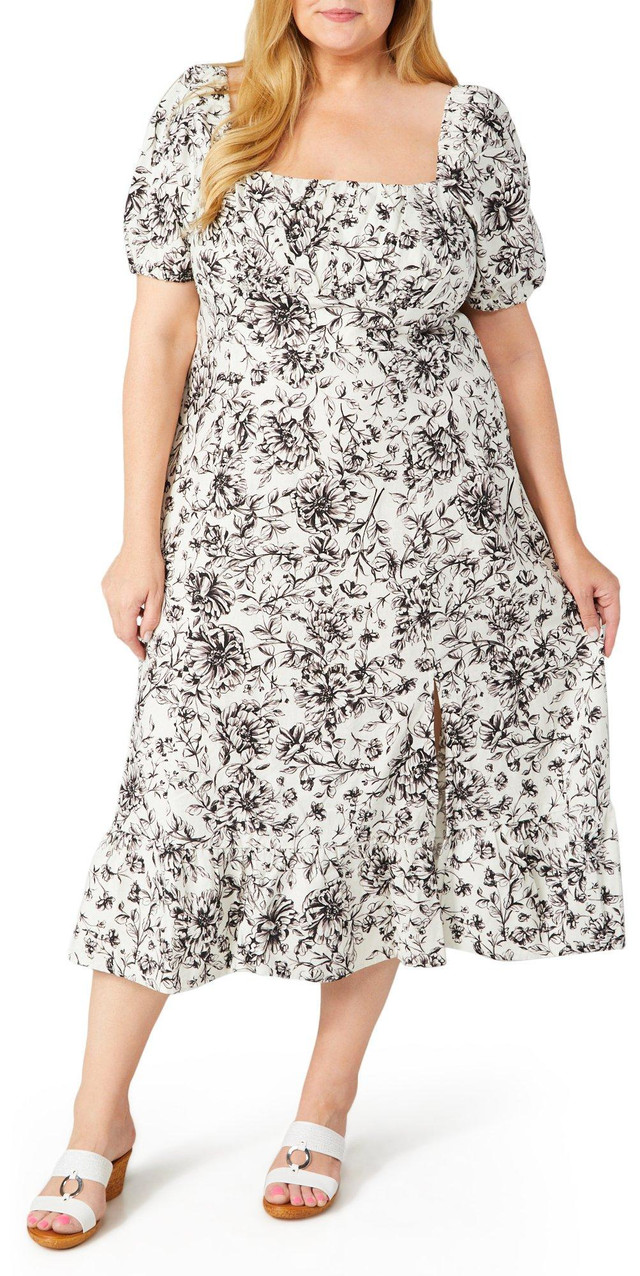 Embrace effortless charm with this Short Sleeve Midi Dress. Featuring an elastic square neckline and a beautiful floral print, this dress is designed to flatter. The leg split adds a touch of allure, making it perfect for any occasion. Crafted for comfort and style, this dress ensures you look and feel your best whether you're attending a garden party or a casual outing. Fabrication is 55% linen, 45% rayon. Lining is 100% polyester.