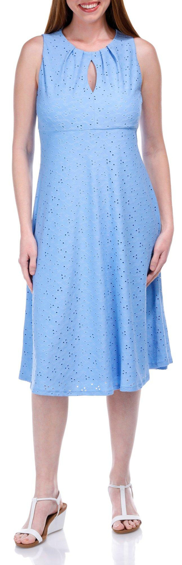 Introducing the Women's Sleeveless Eyelet Midi Dress, crafted from a blend of polyester and spandex. This dress features a stylish solid color, back zip entry and an all-over eyelet design that adds a touch of elegance. The keyhole neckline offers a unique and flattering look, while the 41-inch length provides a perfect fit. Ideal for any occasion, this dress combines comfort and sophistication effortlessly.