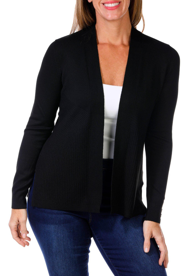 This petite long sleeve open cardigan is soft and warm, featuring a solid color and ribbed texture, making it a versatile and cozy layering piece. Fabrication is 72% rayon and 28% polyester.