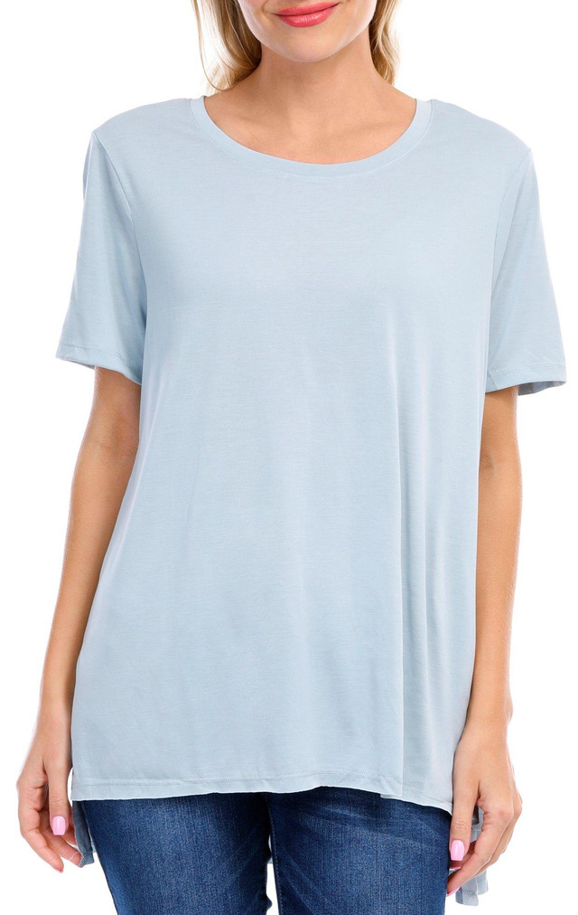 Introducing the Juniors Cupro Crew Neck Top, crafted from a blend of modal and polyester for a soft and luxurious feel. This stylish top features a solid color that effortlessly complements any outfit. The crew neckline and short sleeves provide a classic look, while the high to low hem adds a modern twist. Perfect for both casual and dressy occasions, this top combines comfort and elegance seamlessly.