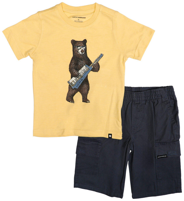 This Lucky Brand Little Boys 2 Piece Set combines comfort and casual style. The washed yellow top features a soft, breathable fabric for all-day ease, while the washed navy blue shorts offer a relaxed fit with two front pockets and two cargo pockets for extra storage. Designed with an elastic waistband, these shorts provide a secure and flexible fit, making this set perfect for play, outings, or everyday wear.