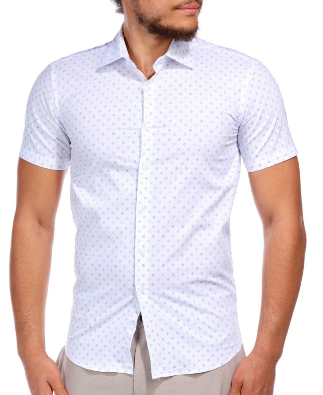 Upgrade your wardrobe with this Men's Geo Print Button Down Shirt. Made from a blend of cotton, polyester, and spandex, this shirt offers a comfortable and flexible fit. The geometric print adds a modern, stylish touch, while the collared neckline and button-down closure provide a classic, polished look. With short sleeves, this shirt is perfect for casual outings or semi-formal events, ensuring you stay stylish and comfortable.