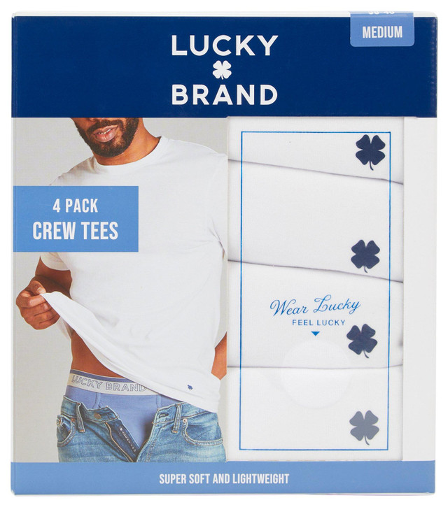 This 4 pack mens tees feature a solid color design on knit soft and breathable all day flex fabric to keep you dry & comfortable, and a finished botton hem that looks good tucked in or out. Includes authentic lucky brand clover near hem.