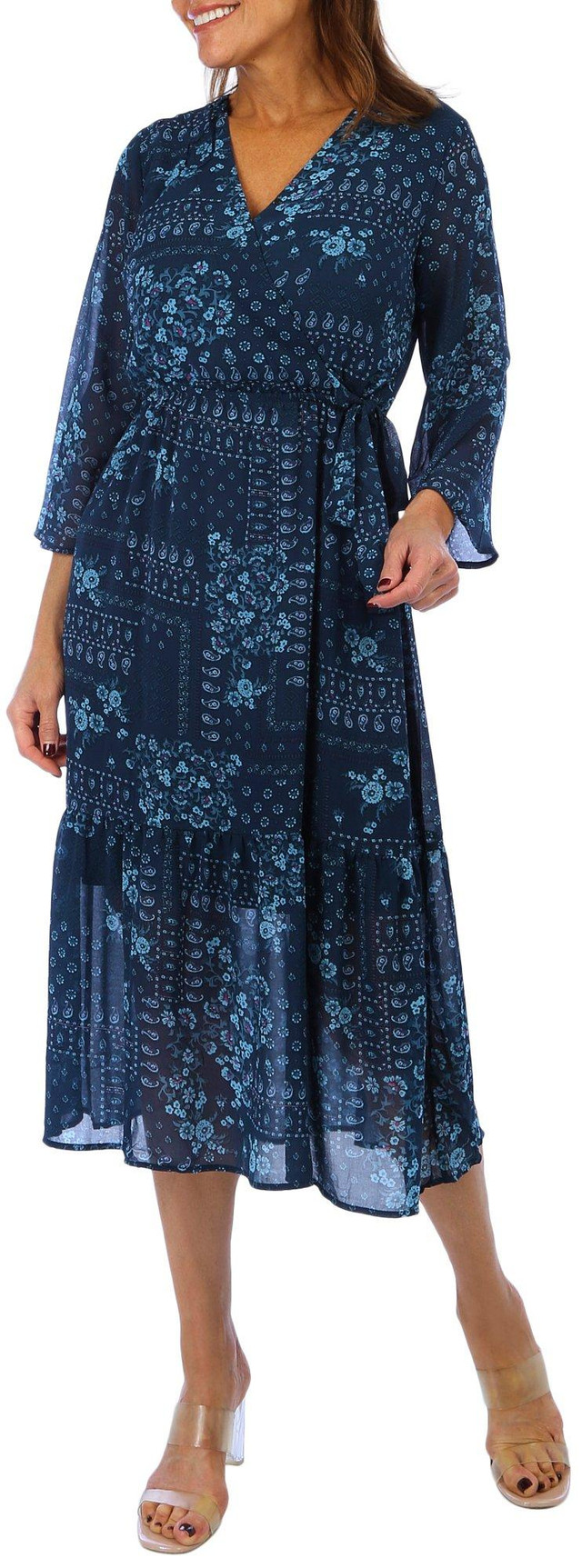 Introducing the Women's Flare Paisley Wrap Dress, crafted from 100% polyester for a lightweight and comfortable fit. This elegant dress features a wrap-styled front with a waist tie, allowing for a customizable and flattering silhouette. The stylish paisley print adds a touch of bohemian charm, while the V-neckline enhances its feminine appeal. With a length of 44 inches, this dress is perfect for any occasion, offering both style and ease of movement.