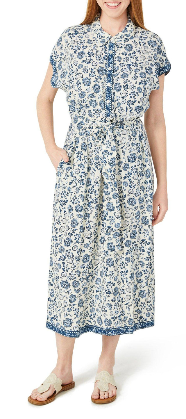 This women's floral shirt dress features short sleeves, a quarter button down front, and a waist tie for a flattering fit. The vibrant floral print adds charm, making it a stylish and comfortable choice for both work and weekend wear. Fabrication 100% rayon.