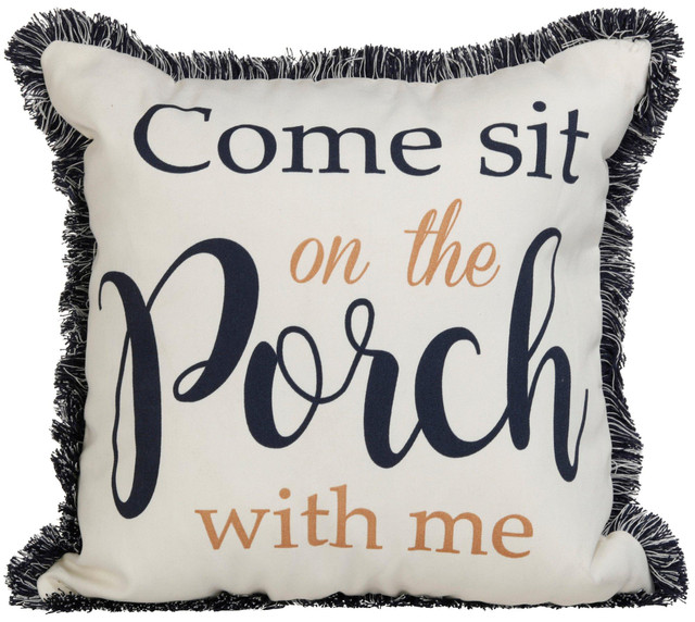 Add some flair to your home with this decorative outdoor pillow, with the words Come sit on the porch with me. This pillow features a fun print design and neutral color palette to compliment your home decor. Measures approximately 16 in x 16 in.