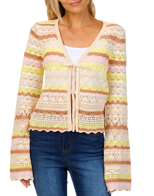 This juniors long sleeve sweater features open crochet stitching, bow tie deail and a sweet multicolored design. The lightweight texture and playful pattern make it a cozy stylish layer for cooler days and casual outfits. Fabrication is 100% cotton.
