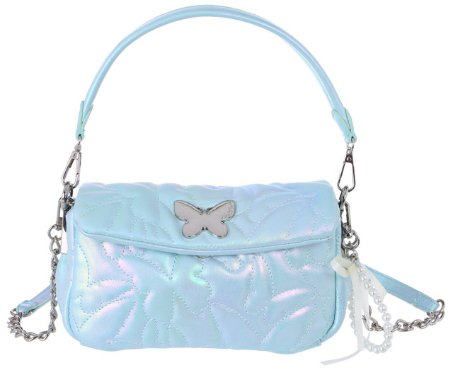 The perfect blend of fashion and functionality, this Butterfly Shoulder Bag is a charming and stylish accessory for any occasion. This bag features a solid color faux leather fabrication with an elegant embroidered butterfly design. It comes with a top handle, a crossbody strap and a pearl wristlet, for versatile carrying options. The inner compartments reveals a lined interior with ample space. Measures approximately 9 in x 5 in x 4 in.