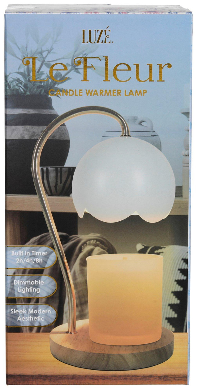 Elevate your ambiance with the Le Fleur Candle Warmer Lamp. Featuring a sleek round wood base, metal shade and stylish gold accented stem, this warmer adds a touch of elegance to any space. Enjoy customizable lighting with its built in timer and dimming capabilities. Suitable for candles up to 3.9 in diameter and 5.75 in height. Includes 1x candle warmer lamp, 1x 50W bulb, and 1x 110 Wall Plug
