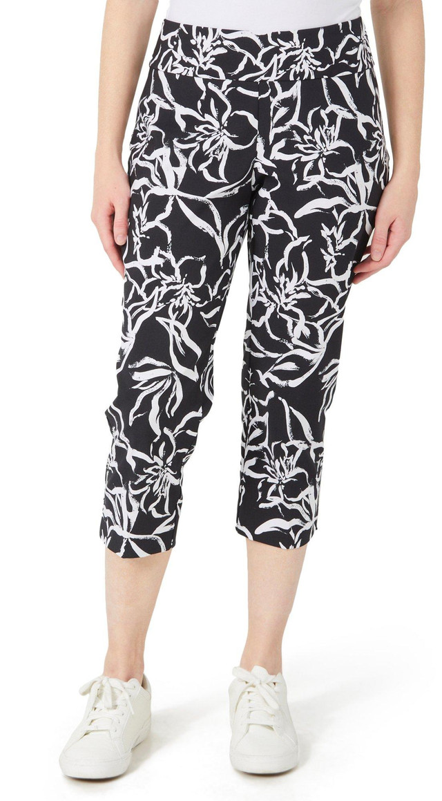 These womens capris feature a chic print with a 22 inch inseam and a sleek modern fit. Made of nylon, rayon, and spandex they offer stretch and comfort with a pull on waistband making them a great choice for work or casual wear.