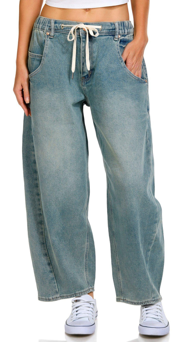 Introducing the Juniors Barrel Drawstring Bubble Jeans, crafted from cotton and spandex for a comfortable fit. These jeans feature a classic 5-pocket cut, a drawstring waistband with button-zip fly closure, and a straight leg fit. With a 26-inch inseam, they offer a stylish and versatile look perfect for any casual occasion.