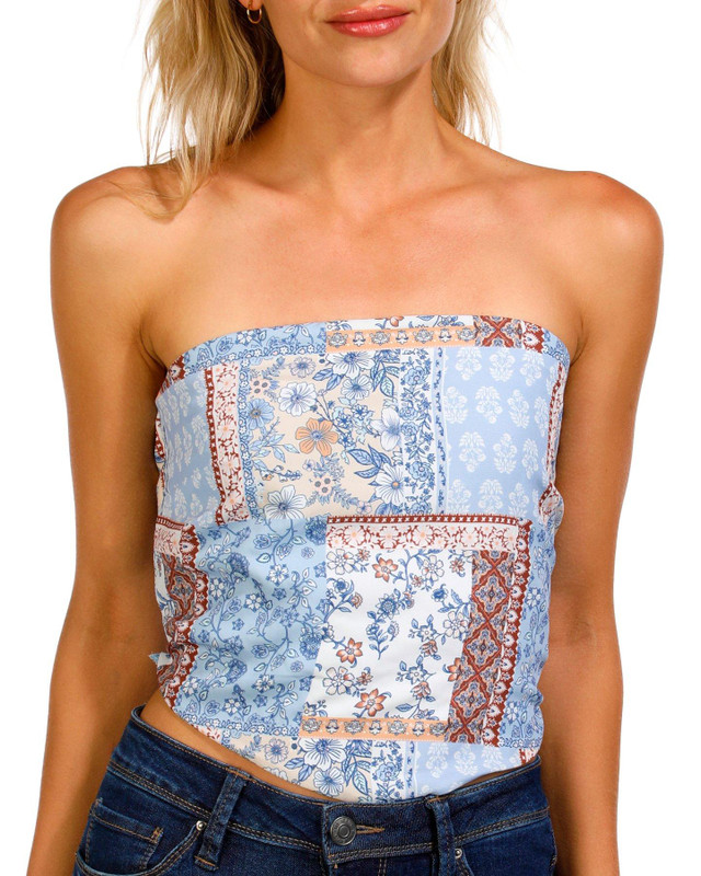 This Juniors Scarf Tube Top is crafted from a premium polyester, for a comfortable and flattering fit. It features a high low hem, smocked backing for a comfortable fit, and a stylish tie in the back detail. The cropped length of 11 inches adds a trendy touch, making it perfect for any casual outing or summer event. Embrace a blend of fashion and comfort with this chic tube top. Fabrication is 100% polyester. Top length measures approximately 11 in.