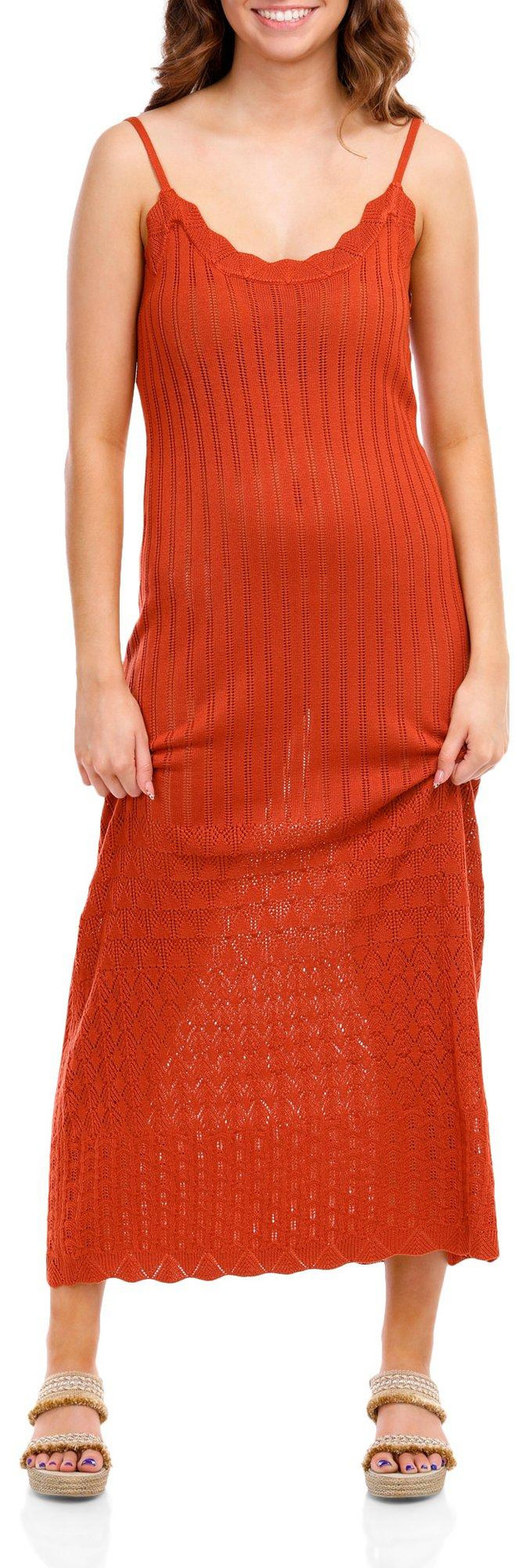 The Juniors Sleeveless Crochet Midi Dress, made from 100% acrylic, features a stylish solid crochet exterior. With its sleeveless design, scallop hem, scoop neckline, and 45-inch length, this dress offers a chic and elegant look, perfect for any occasion.