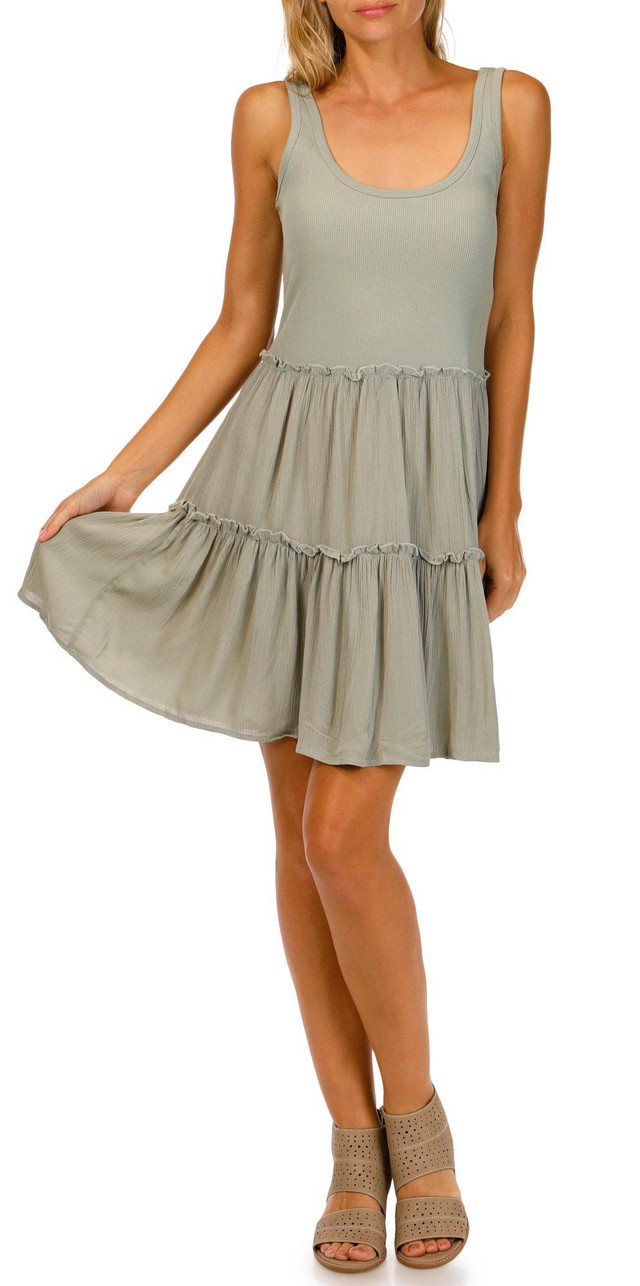 Stay sweet and stylish in this Juniors Sleeveless Tier Tank Dress. Designed in a solid color with a scoop neckline, it features padded cups for added support and a flouncy ruffle tier skirt for playful movement. Perfect for sunny days or casual outings. Fabrication 66% polyester, 26% rayon, and 8% spandex