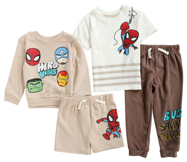 This fun four piece set gives your little hero plenty of mix and match outfit options. It includes two tops featuring bold Spiderman designs, one with long sleeves and one with short sleeves, along with a pair of comfy shorts and a pair of matching pants. Each piece is made from soft, easy moving fabrics that keep toddlers comfortable through playtime and everyday adventures. A great choice for any Spiderman fan.