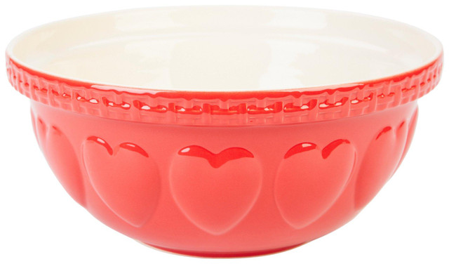 Bring heartfelt charm to the kitchen with the 11.75 in Hearts Red Mixing Bowl. Featuring a bold red exterior with large embossed hearts and a classic white interior, it blends warmth and function for everyday baking. Ideal for mixing batters doughs or serving with love. Dishwasher safe for easy care. Fabrication is 100% ceramic. Measures approximately 5.25 in high x 11.75 in diameter.