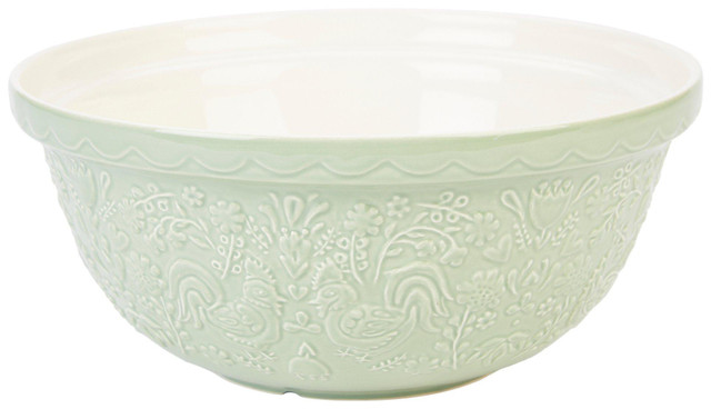 Add rustic charm to the kitchen with the 11.75 in Home To Roost Green Mixing Bowl. Featuring a soft green exterior with an embossed country inspired design of chickens and florals, and a classic white interior, it brings warmth to baking and prep. Ideal for mixing dough batters or serving with farmhouse flair. Dishwasher safe for easy care. Fabrication is 100% ceramic. Measures approximately 5.25 in high x 11.75 in diameter.