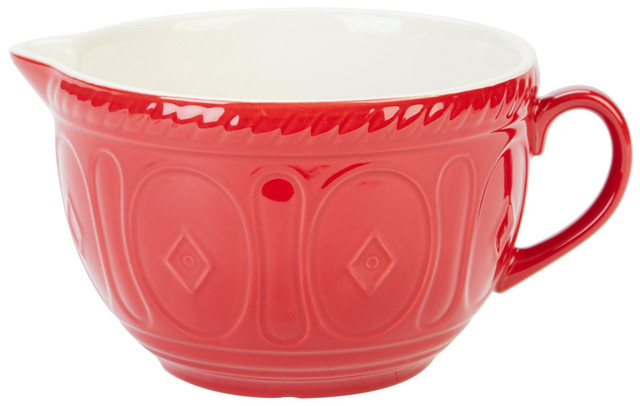 Add vibrant tradition to your kitchen with the 8 in Color Mix Red Batter Mixing Bowl. Featuring a bold red exterior with a rustic embossed pattern, it includes a sturdy handle and convenient pour spout for controlled mixing and pouring. Ideal for preparing batters doughs or sauces with classic style. Dishwasher safe for easy cleanup. Fabrication is 100% ceramic. Measures approximately 5 in x 8 in diameter. Holds 68 oz.