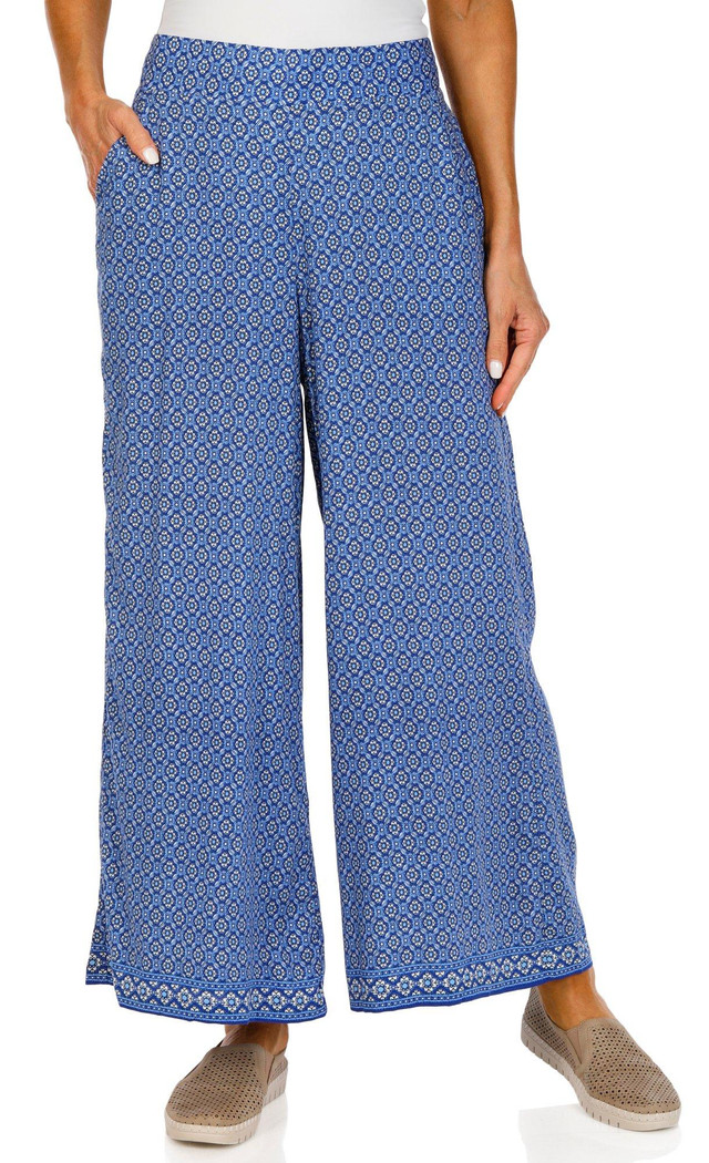 These womens textured rayon cropped pants feature a back elastic waistband and two front pockets for comfort and convenience. With a wide relaxed leg fit and printed pattern, they offer a stylish and breezy look perfect for casual wear. Inseam is approximately 26 in. Fabrication is 97% rayon and 3% spandex.
