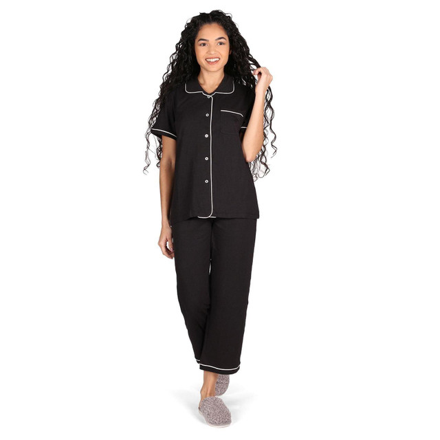 Get better zzzs in our Coral Reef Notch Collar PJ Set! It features a silky smooth and breathable button front top with short sleeves and a single chest pocket, and capri bottoms that are flattering, lightweight, and finished with a classic contrast piping trim detail. Designed with an adjustable and stretchy drawstring waistband that's ideal for napping, relaxing, and everything in between. Comes with a drawstring bag for gifting or transportation. Fabrication 52% cotton, 48% rayon.