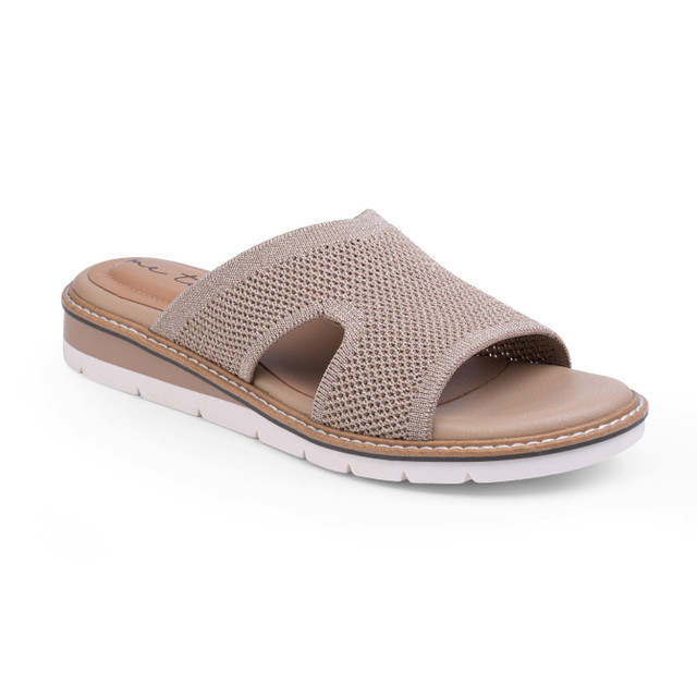 Me Too Originals is a women's footwear brand focused on combining style and comfort. These stylish ASTA wedge slide sandals feature a knit stetch upper, 1 in. wedge heel, stacked rubber treaded sole and memory foam padded foot sock.