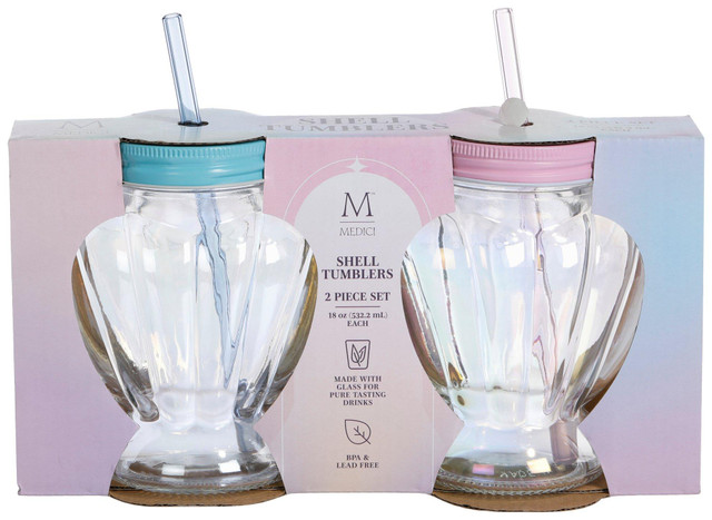 Sip in style with these 2 Pk of 18 Oz Clear Glass Shell Tumblers! Featuring a cute shell design, a colorful iridescent hue and a matching straw. Designed with scratch resistant glass and is lead and BPA-free. Perfect for adding charm to your daily hydration. Made with glass for pure tasting drinks! Fabrication is 100% glass. Each holds 18 fl oz. Measures approximately (without straw) 5.5 in x 5 in x 3 in.