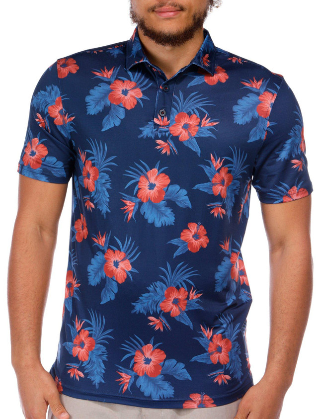 Introducing the Littleton Performance Polo, designed for both style and functionality. Featuring a sleek hibiscus print design, this polo offers UPF protection to shield you from harmful sun rays. The stretch fabric ensures a comfortable fit and ease of movement, making it perfect for active days. Fabrication is 89% polyester, 11% spandex.