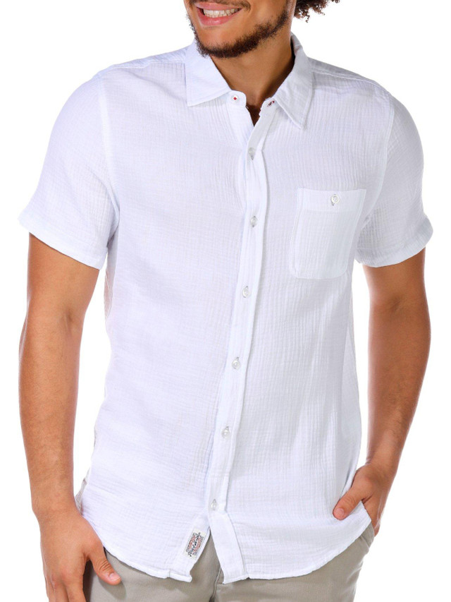 Stay cool and casual in the Men's Short Sleeve Gauze Button Down Shirt. Made with lightweight gauze fabric, it features a solid color, classic collar, chest slip pocket, and button-down front. Fabrication 100% cotton