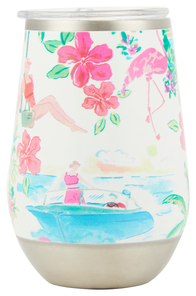 This stainless steel wine tumbler features a tropical boat scene and includes a lid. It combines playful coastal style with convenient, on the go sipping. Capacity is 12 oz.