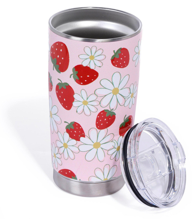 Meteor drinkware and accessories are durable and reliable with a splash of artwork that makes them stylish as well. This travel tumbler keeps drinks hot or cold longer, reduces condensation, and features a cute strawberry design. Spill-proof lid included. Holds 20 oz.